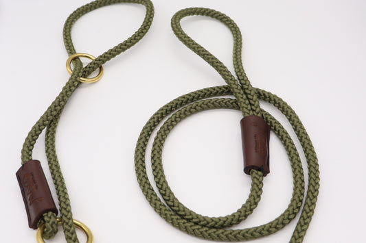 Handmade Traditional Gundog Slip Lead - Solid Brass and Leather with Black or Olive Nylon Rope